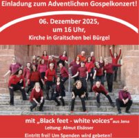 Der Gospelchor „black feet white voices“ aus Jena lädt zu einer musikalischen Reise durch die Weihnachtsgeschichte ein. Gospel, Swing und Spirituals in bis zu achtstimmigen Arrangements laden zum Zuhören, Genießen und Mitsingen ein. Alles a-capella, nur ab und an begleitet von Percussion: Das macht „black feet white voices“ aus. Die…