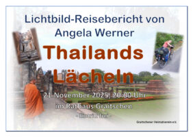 Eine Radreise durch den Norden Thailands Zu einem Lichtbild-Reisebericht „Thailands Lächeln“ von Angela Werner lädt der Graitschener Heimatverein am Freitag, den 21. November 2025, um 20 Uhr in den Rathaussaal zu Graitschen ein.Mit dem Fahrrad erkundet Angela Werner vier Wochen den Norden Thailands, sie radelt durch die Bergwelt, ist begeistert…