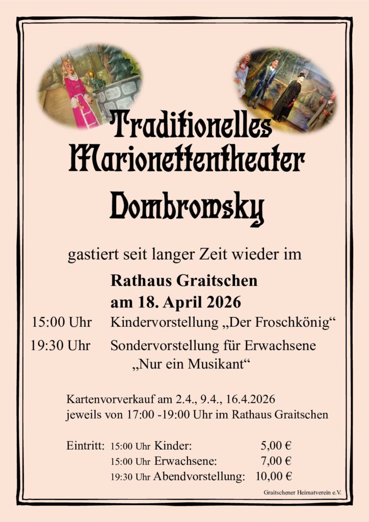 Nach langer Zeit gastiert das Wandermarionettentheater Dombrowsky erneut mit zwei Aufführungen in Graitschen. Die Familie Dombrowsky blickt auf eine über 200jährige Familientradition zurück, beherrscht grandios ihre Kunst und erweckt damit ihre Marionetten zum Leben.